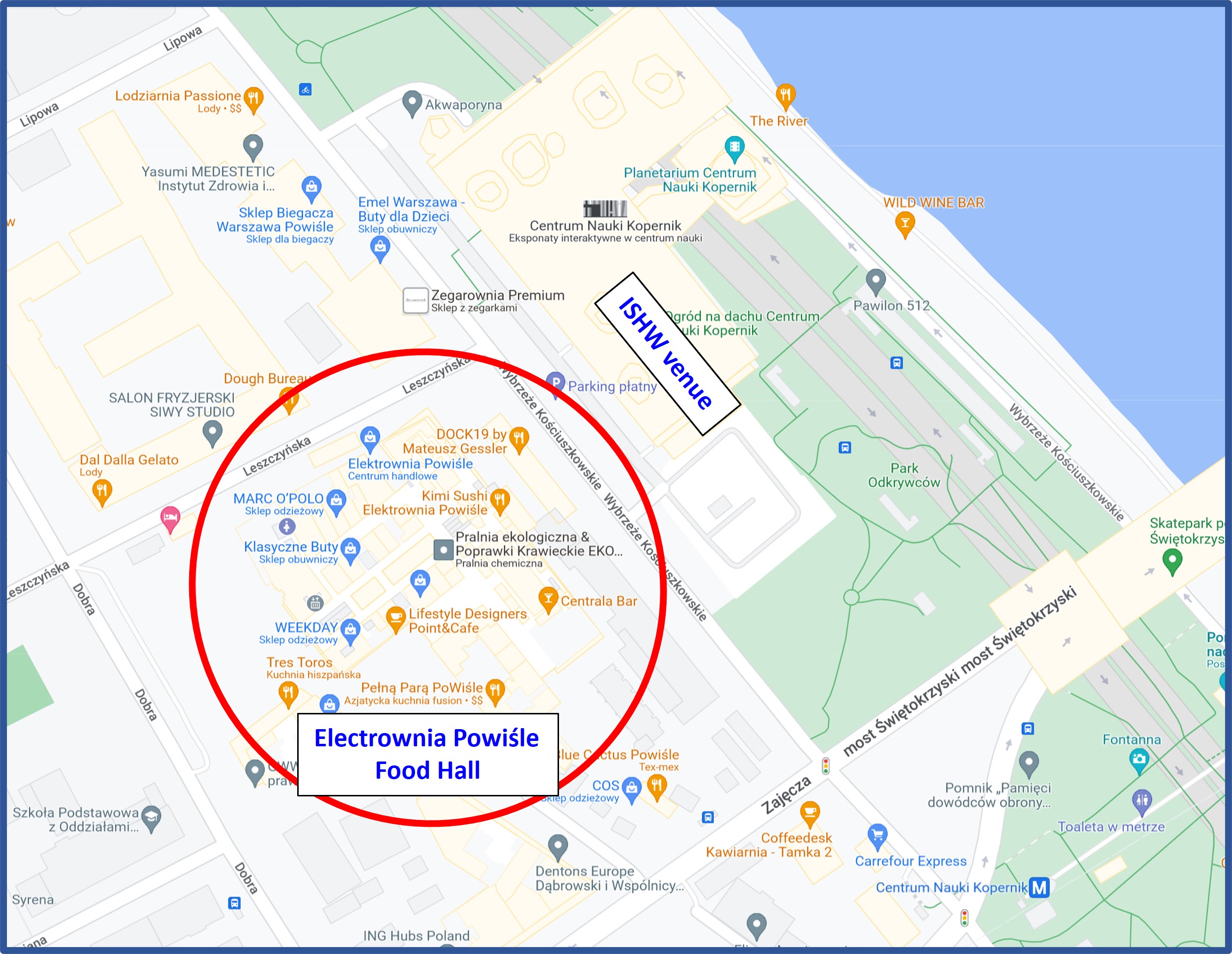 Just in front of the ISHW venue (Copernicus Science Centre) the Elektrownia Powiśle is located with a Food Hall. There are many various restaurants, from Japanese cuisine to fresh seafood accompanied by fantastic Spanish or Polish wine.